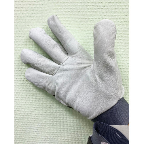 Данные перчатки пользуются широкой популярностью благодаря своему хорошему качеству и долговечности в использовании. Перчатки комбинированные из высококачественной козьей кожи и хлопчатобумажной ткани, без подкладки, с прямым запястьем и вшитой эластичной резиновой полоской, поэтому они нисколько не мешают выполнению работ. Прочная натуральная кожа на рабочей стороне изделия обеспечивает длительную и верную защиту от истирания и механических повреждений, а благодаря дышащей ткани, руки в таких перчатках не запотевают даже при длительной работе.Размер:10, Шитые перчатки, материал - кожа/ткань ХБ, цвет - белый/синий.