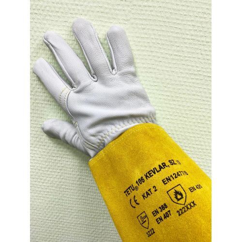 Перчатки-краги для аргоно-дуговой (TIG) сварки TETU 106 K/V изготовлены из качественной козьей кожи белого цвета с удлиненным манжетом из кожевенного спилка желтого цвета. Швы выполнены нитью KEVLAR, что увеличивает устойчивость перчаток к воздействию искр. Перчатки не имеют подкладки, что обеспечивает пальцам хорошую чувствительность. Эластичная резинка на запястьях надежно удерживает краги на руках, позволяя свободно работать в течение длительного времени. Для точных сварочных работ.Размер: 11. Шитые перчатки, материал - козья кожа/спилок, цвет - белый/желтый.
